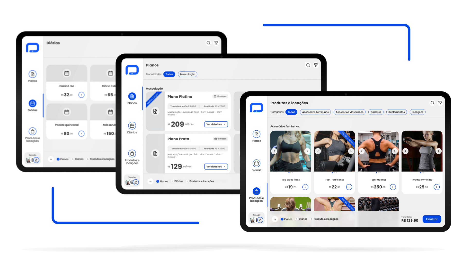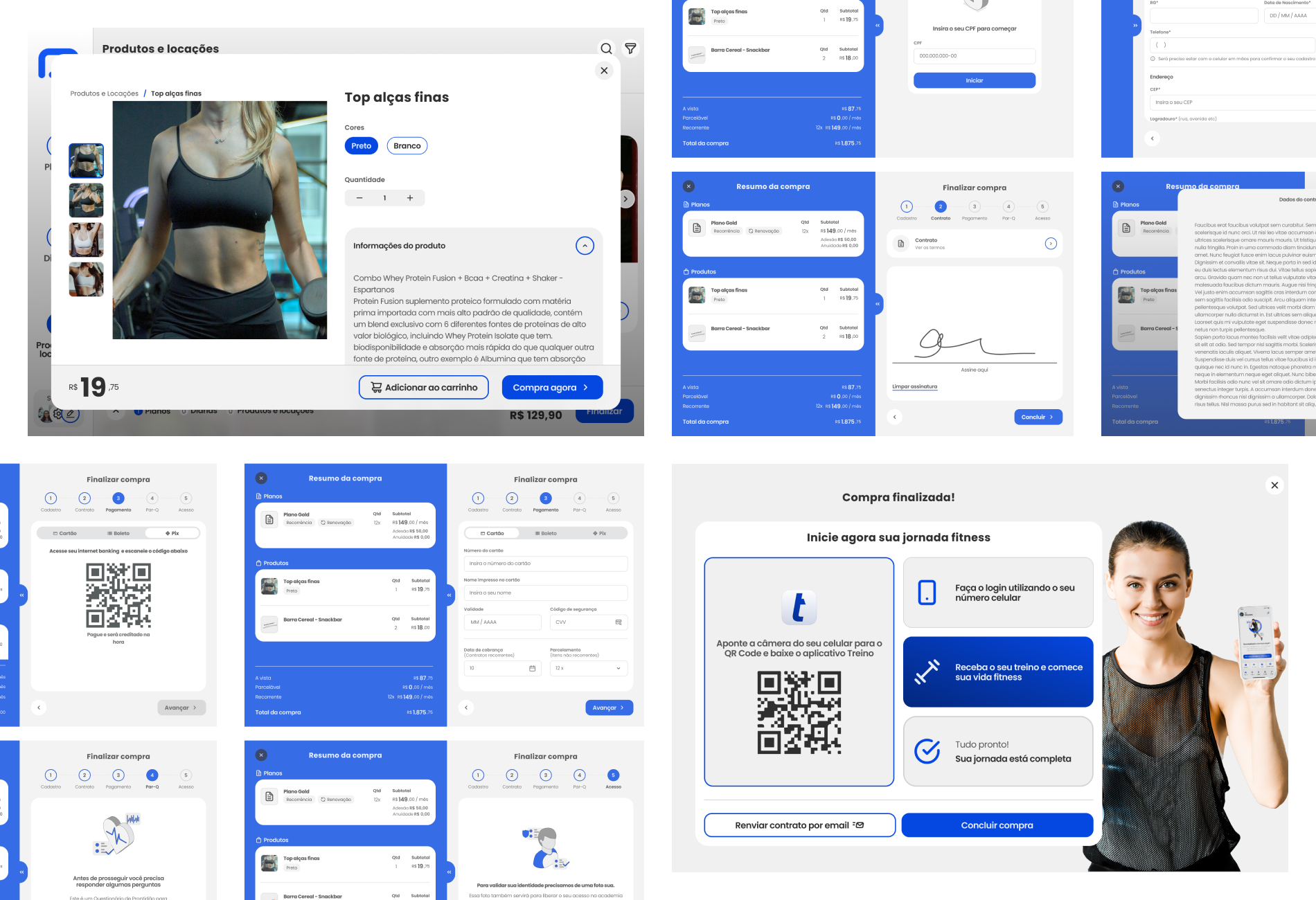 No app, a academia pode vender e renovar planos, além de diárias e produtos Todo o processo de matrícula é formalizado com segurança através da assinatura digital, reconhecimento facial e integração automática com o App Treino.